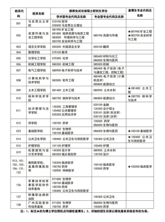 南华大学2026年接收推荐免试攻读研究生学位(含直博生)招生专业代码一览表