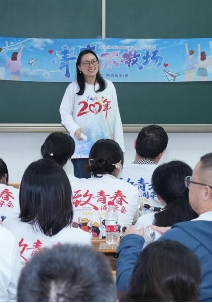 下午,“青春不散场”主题班会温情举行。当年的辅导员谭文丽老师应邀出席,与校友们共叙情谊。班会上,谭文丽老师详细介绍了学校在学科建设、人才培养、科研创新等方面的发展成果,寄语校友们立足医疗岗位,坚守医者初心,深耕科研创新,不断提升专业能力,以此更好地服务社会。同时,她诚挚期盼校友们常回母校交流,持续关注与支持母校的发展。
