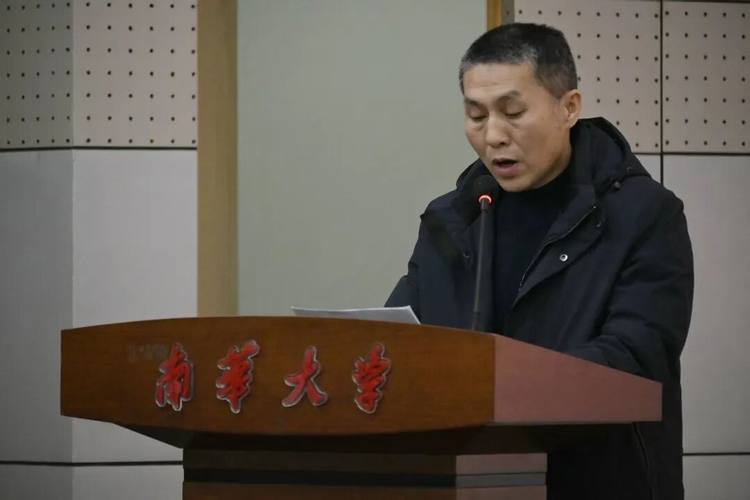 陈列尊向全体获奖学生表示热烈祝贺,并对彭文胜校友饮水思源、回馈母校的深厚情谊与慷慨义举表示感谢。他指出,彭文胜校友的捐赠不仅是一份物质奖励,更是一份精神传承,生动诠释了南华人感恩奉献、砥砺奋进的优秀品格。陈列尊还寄语全体学子要以获奖同学为榜样,以彭文胜校友为标杆,深刻理解并自觉践行“南华精神”。他勉励同学们要坚定理想信念,锤炼高尚品德,扎实学好专业知识,努力成长为堪当民族复兴大任的时代新人。