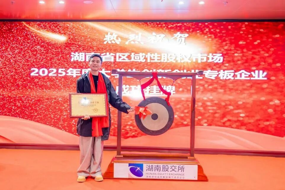 从母校出发,他的脚步正迈向更广阔的舞台。2025年9月,宋宏霖创立的公司在湖南股权交易所大学生创新创业专版挂牌;四个月后的授牌仪式上,他接过了那块标志性的牌匾。这位从南华校园走出的年轻创业者,正以“轻量化定制”为切入点,迈向更广阔的文创舞台。