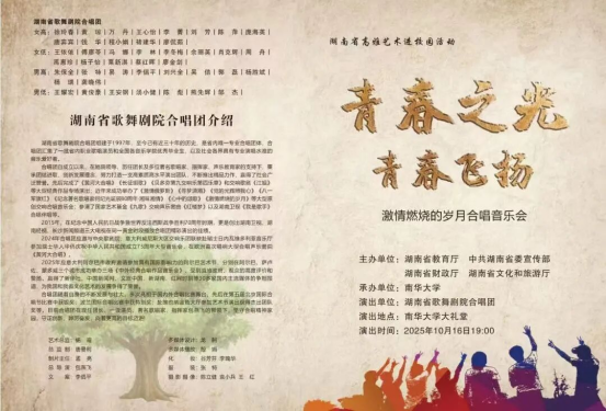 华诞之日,雅乐未央。校庆日当晚,湖南省“高雅艺术进校园”活动——激情燃烧的岁月合唱音乐会将在南华大学大礼堂奏响。诚挚邀请各位校友莅临欣赏,在湖南省歌舞剧院合唱团的恢弘歌声中,为这一日的温情与荣光留下一段隽永回响。
